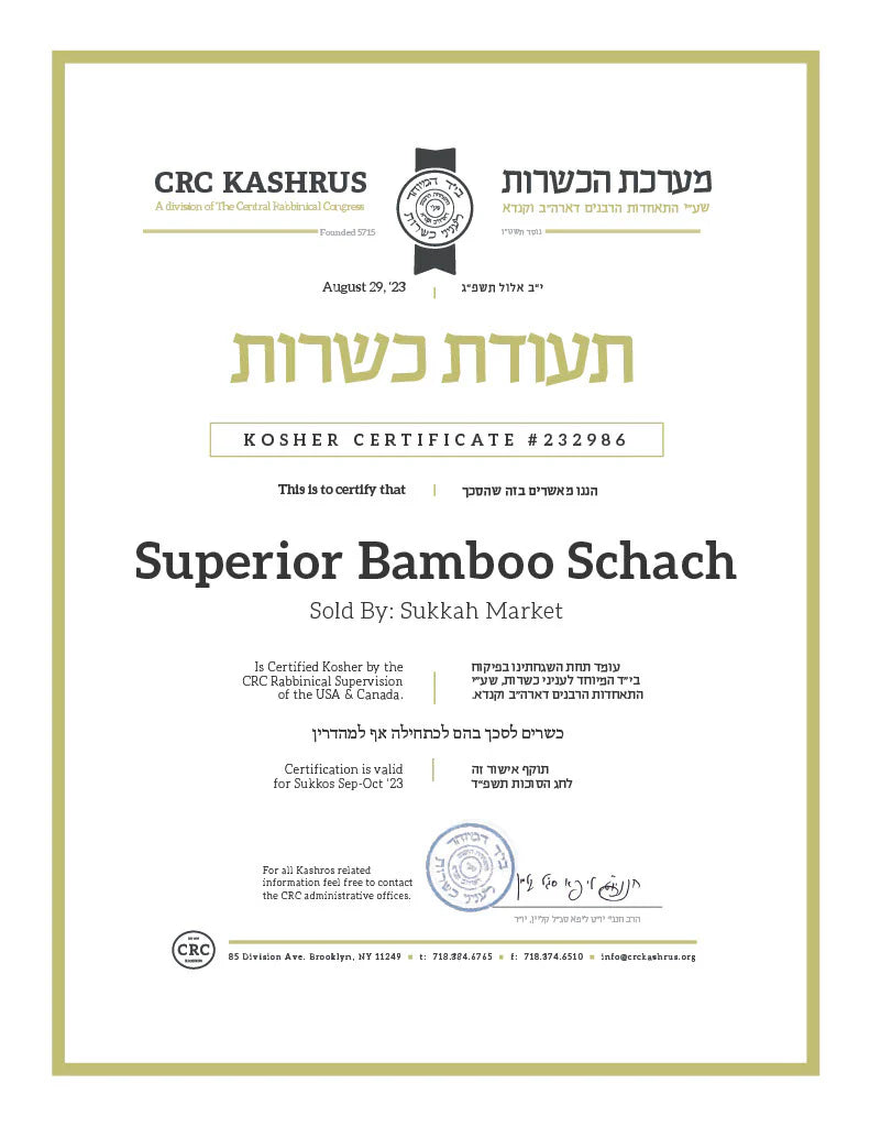We’ve acquired the best 3rd party Rabbinical Certification Agency, The CRC, (התאחדות הרבנים דארה”ב וקנדא) to ensure our Sukkah’s are kosher compliant, adhere to the strict laws of Sukkah according to leading Rabbinical experts and are fully Kosher in every sense of the word.